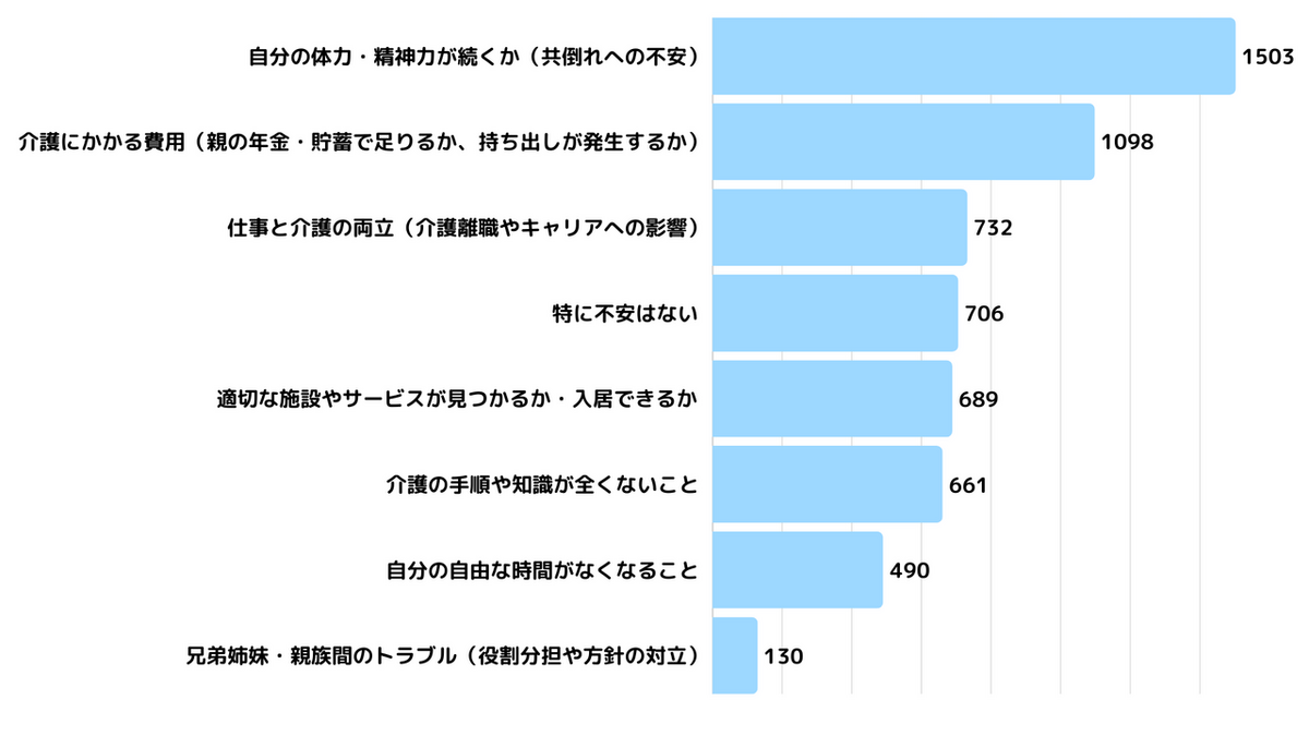 これは、介護をする側も年を重ね、昔に比べて無理がきかなくなっている現実を反映しています。親を支えたい気持ちはあるものの、「自分の体が悲鳴を上げたら終わりだ」という危機感が、経済的な不安以上に切実な課題となっているのです。