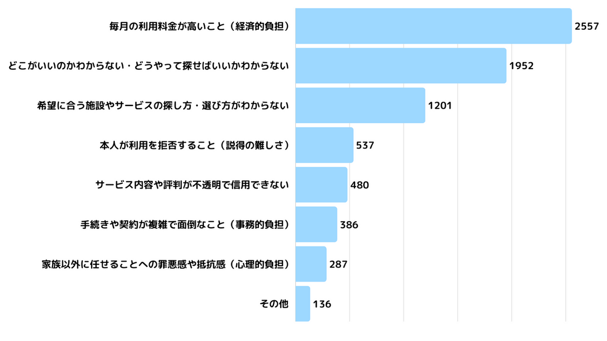 在宅介護の限界を感じた時、頼りになるのが外部サービスや施設です。しかし、利用検討時のハードルとして、半数近くの人が「毎月の利用料金が高いこと(2,557人)」を挙げました。
