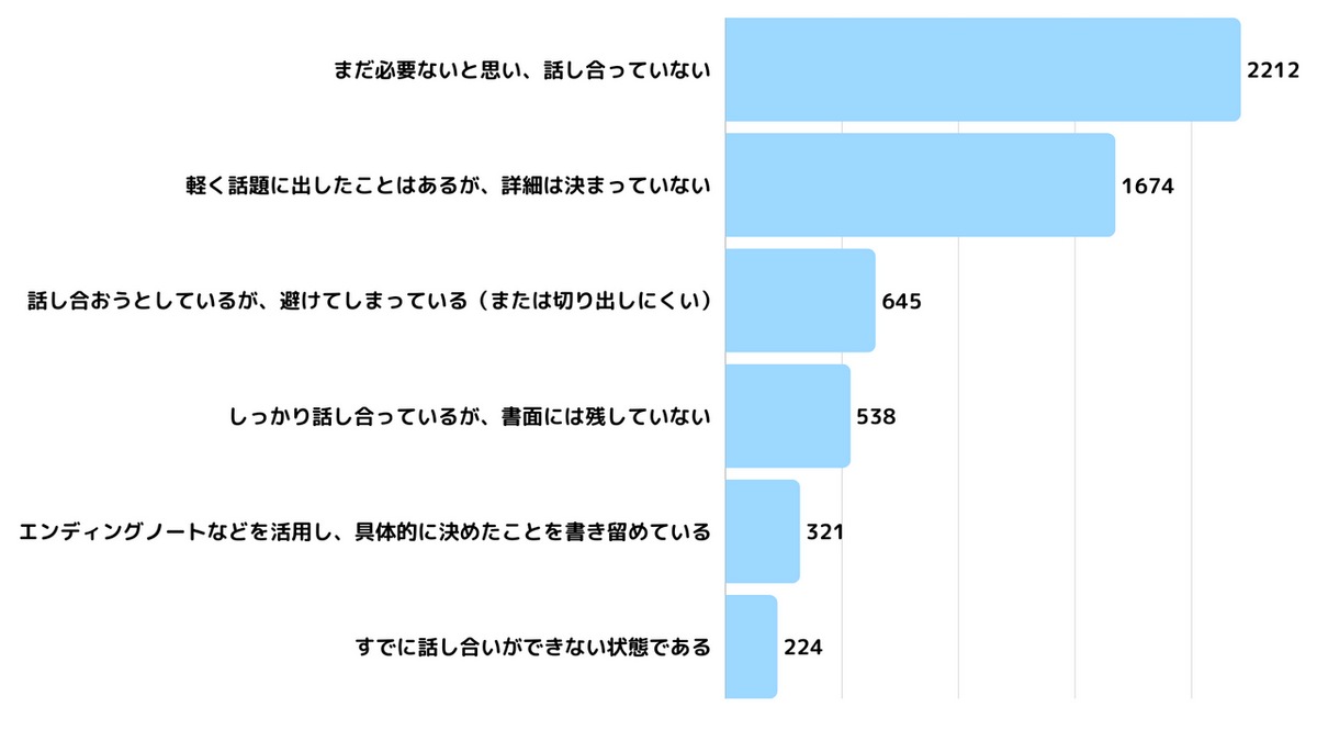 しかし、その負担を減らすために最も重要な「事前の話し合い」ができているかを確認すると、「まだ必要ないと思い、話し合っていない(2,212人)」「軽く話題に出したことはあるが、詳細は決まっていない(1,674人)」など、具体的に決めている人はごくわずかでした。