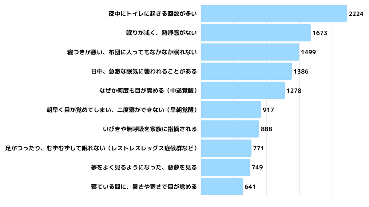 その具体的な原因を探るべく「睡眠の悩み」を聞いたところ、トップになったのは「夜中にトイレに起きる回数が多い(2,224件)」でした。次いで「眠りが浅い(1,673件)」「寝つきが悪い(1,499件)」と続きます。