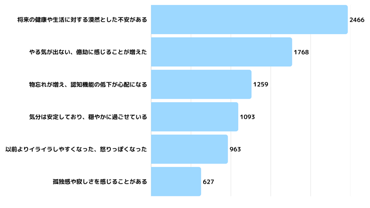 一方、メンタル(心の状態)についてはどうでしょうか。最も多くの票を集めたのは「将来の健康や生活に対する漠然とした不安がある(2,466件)」でした。具体的なトラブルというよりは、老後の生活資金や自身の健康、介護など、先が見えないことへの不安が心のモヤモヤとなっているようです。