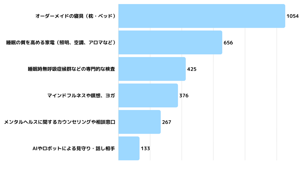 興味深いのは、これから試してみたいサービス・商品です。「メンタルヘルスに関するカウンセリング(267件)」への関心は低く、圧倒的に人気だったのが「オーダーメイドの寝具(1,054件)」や「睡眠の質を高める家電(656件)」でした。