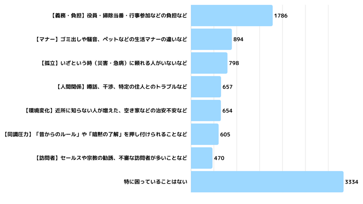 「地域の維持には必要(1,603人)」という高い意識を持ちつつも、「無理なく続けられる形に変えていきたい」という本音が、「辛い・面倒(1,186人)」という回答の裏には隠されているのかもしれません。
