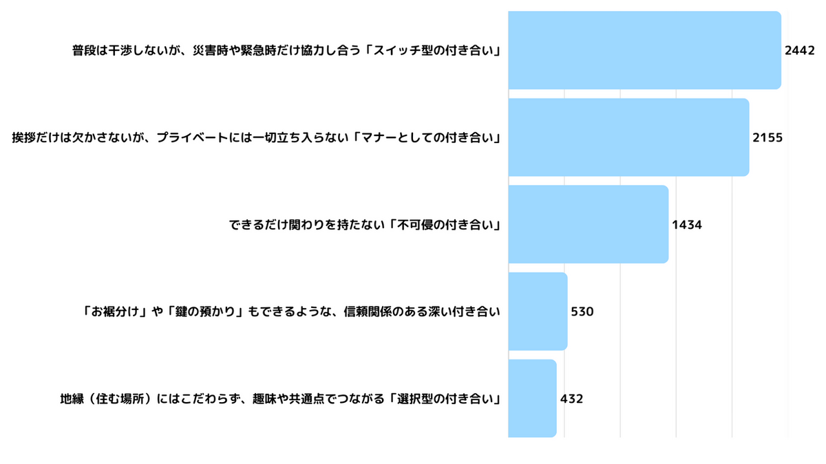 理想的な距離感として最も支持を集めたのは「普段は干渉しないが、災害時や緊急時だけ協力し合う『スイッチ型の付き合い』(2,442人)」でした。