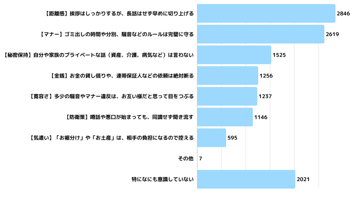 では、その「心地よい距離感」を保つために、皆さんはどんな工夫をしているのでしょうか。 円満な関係を保つための「マイルール」を聞いたところ、1位は「挨拶はしっかりするが、長話はせず早めに切り上げる(2,846件)」でした。