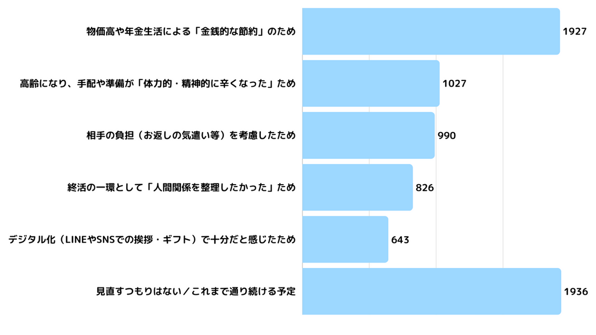 続いて多かったのが「高齢になり、手配や準備が『体力的・精神的に辛くなった』ため(1,027人)」ですが、注目すべきは3番目の「相手の負担(お返しの気遣い等)を考慮したため(990人)」です。シニアにとっての「贈る習慣の見直し」は、単なる「面倒くさい」や「お金がない」という自分の都合による理由だけではありません。「自分が贈ることで、相手にお返しの気を遣わせてしまうのではないか」という、相互の負担軽減を願う「思いやり」が、習慣を変える大きな後押しとなっていることがわかります。