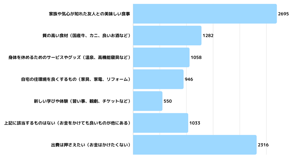 一方で、ポジティブな使い道として注目したいのが、「ここにはお金をかけても良い」と思うものとして選ばれた「家族や気心が知れた友人との美味しい食事(2,695人)」です。形式的な「ハガキや品物のやり取り(モノ)」は減らしつつも、本当に大切な人と直接会って過ごす「食事や時間(コト)」には投資を惜しまない。「広く浅い付き合い」から「狭く深い付き合い」へ。 シニア世代の価値観が、より本質的な幸福へとシフトしている様子がうかがえます。