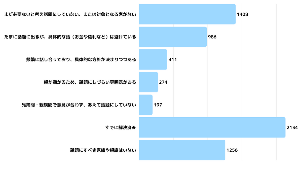 将来、誰も住まなくなった後の実家の扱いについて聞いたところ、「まだ必要ない」「話題にしていない」と回答した人が1,408人と多く、具体的な話を避けている層(986人)と合わせると、多くの家庭で問題が先送りされている現状が見て取れます。