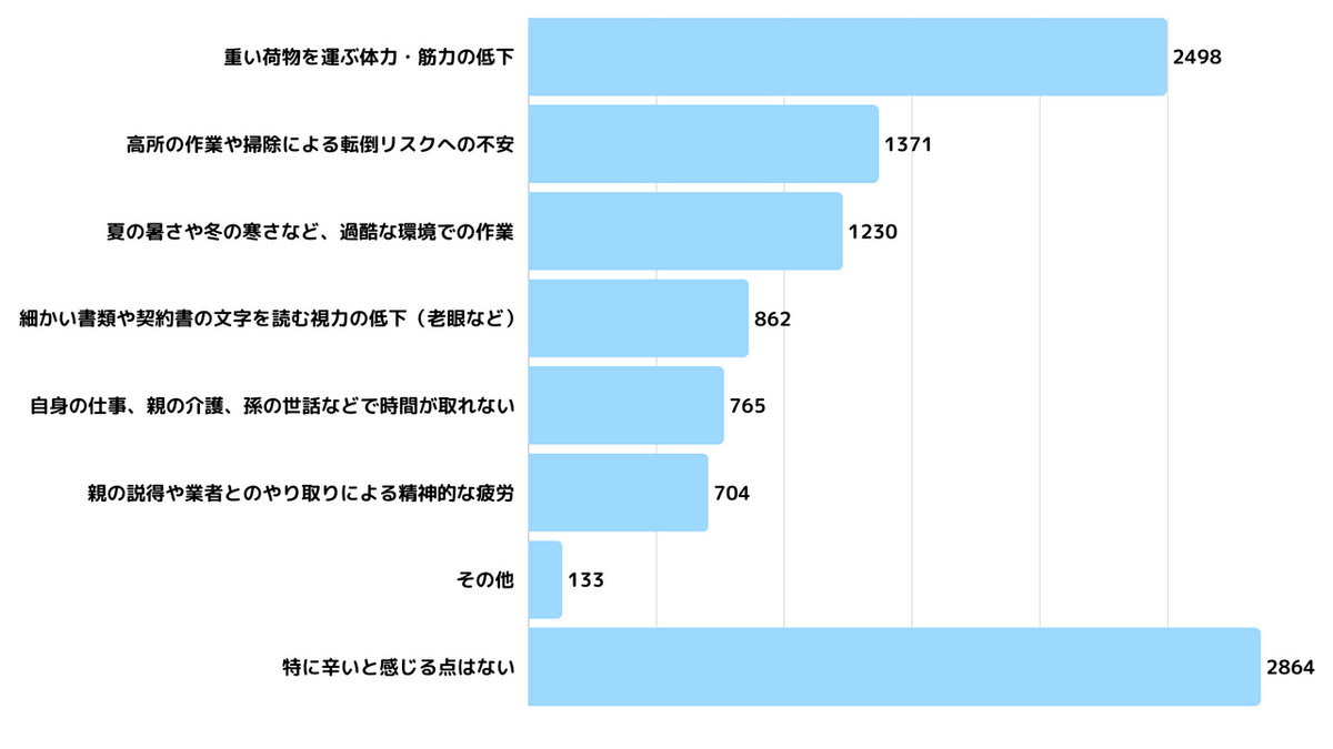 さらに、「年齢を重ねたからこそ辛い点」を具体的に聞くと、「重い荷物を運ぶ体力・筋力の低下(2,498件)」がダントツのトップに。次いで「高所作業による転倒リスク(1,371件)」、「夏の暑さや冬の寒さ(1,230件)」が続きます。