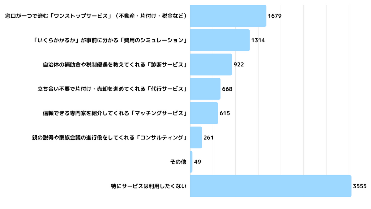 こうした課題に対し、求められているサービスとして最も多かったのが「窓口が一つで済むワンストップサービス(1,679件)」です。不動産の売却、不用品の処分、税務手続きなど、実家じまいには複数の専門知識が必要です。それらを個別に探す労力が、シニア世代にとって大きなハードルとなっていることがわかります。