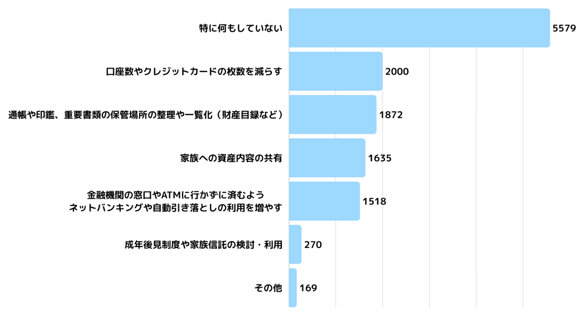アンケートでは、加齢による判断能力低下(認知症など)や身体的な衰えによる資産管理に「不安を感じている(非常に不安を感じている・やや不安を感じているの合算)」人は、約71%に達しています。一方で、その対策として「具体的に行動していること」を聞くと、過半数の5,579人が「特に何もしていない」と回答しました。